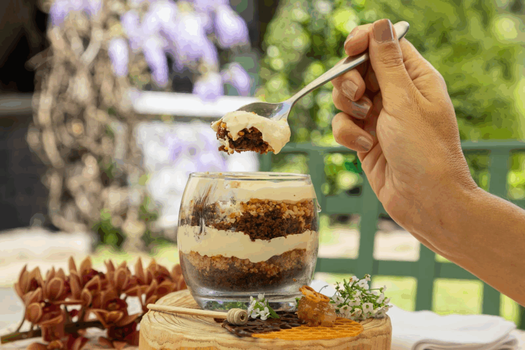 Ah! E, claro, as sobremesas “queridinhas” da chef: Verrine refrescante; Bolo de mel com creme de rosas e praliné de macadâmia; Torta de frutas vermelhas com sorvete de creme; e Panna Cotta de leite de coco com coulis de amora (opção vegan).