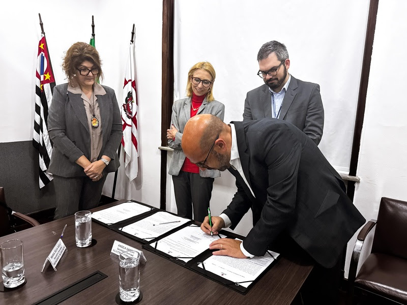 A ação, que reforça o compromisso de ampliar ações intersecretaiais por uma educação de qualidade, contou com a participação do Secretário Adjunto de Educação, Samuel Ralize, a Secretária Executiva Pedagógica, Maria Sílvia Bacila, e a Secretária Municipal de Relações Internacionais, Angela Gandra, durante a assinatura do convênio.