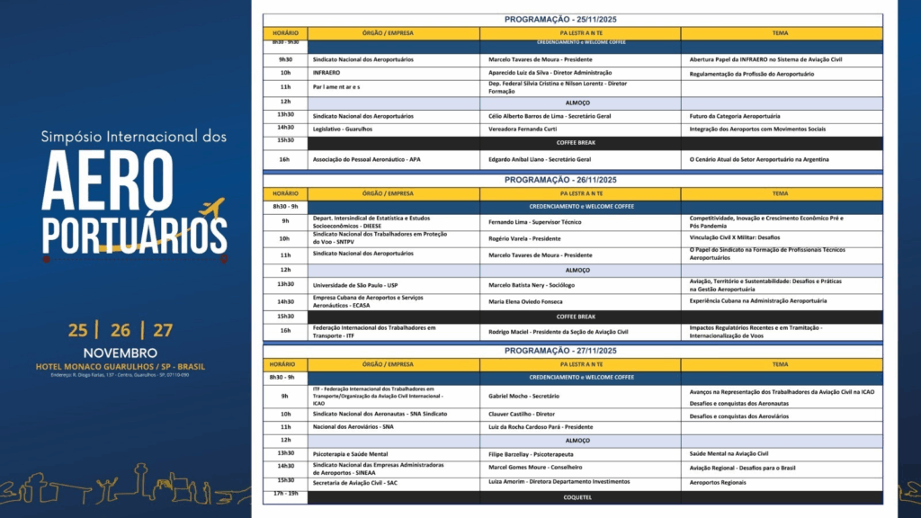 Entre os dias 25, 26 e 27 de novembro de 2025, será realizado no Hotel Monaco, em Guarulhos, São Paulo, o Simpósio Internacional dos Aeroportuários. O evento reunirá profissionais e representantes do setor para debater o tema “Cenário e desafios da aviação civil na América do Sul e Caribe: mão de obra, sustentabilidade, infraestrutura e aeroportos regionais.”